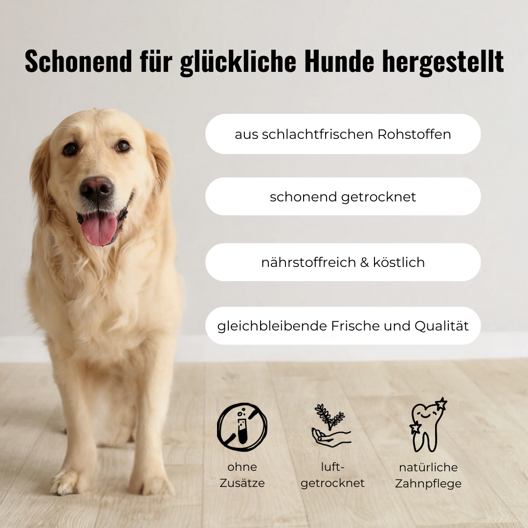 Unsere Kausnacks sind Naturkauartikel ohne künstliche Zusätze. Deshalb können Form, Farbe und Größe variieren – ein Stück Natur für deinen Hund.