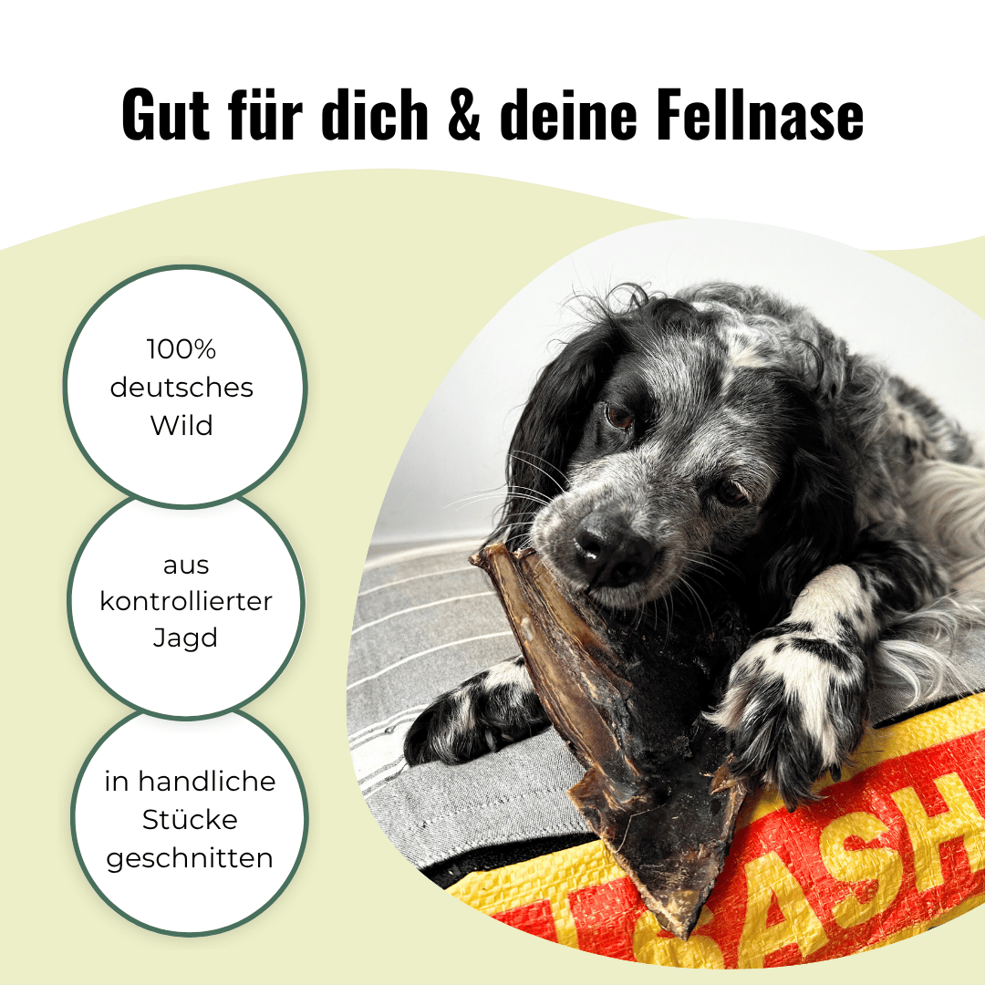 Unsere Rehrippen werden in handliche Stücke vorgeschnitten, damit sie einfacher portionierbar sind. So können auch mittelgroße Hunde sie problemlos genießen, und du hast beim Füttern weniger Aufwand.