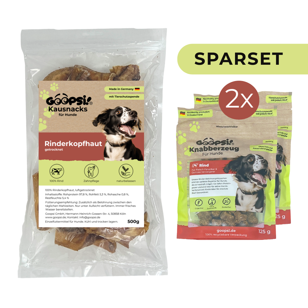 Rinderkopfhaut 500g + Hundeleckerlis Rind (2x125g) im Sparset